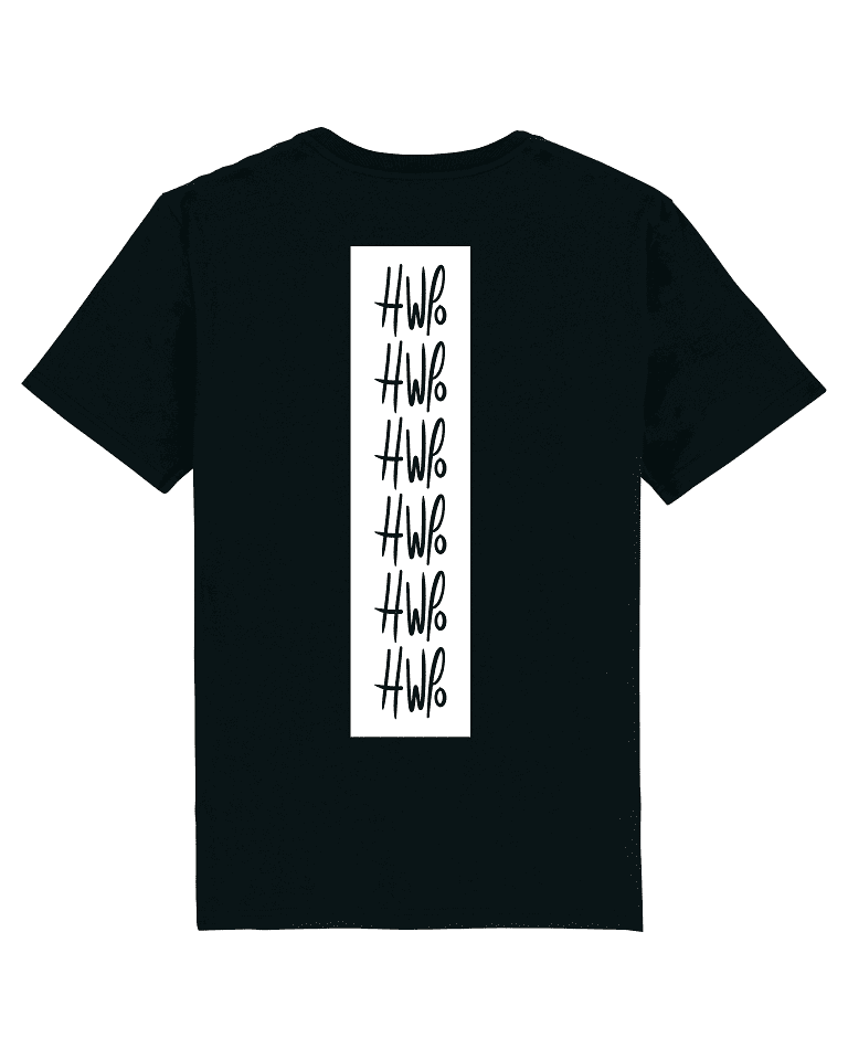 Le t-shirt « Énergie » se distingue par un design audacieux avec l’inscription répétée « HWPO » à l’arrière, symbolisant dynamisme et persévérance.